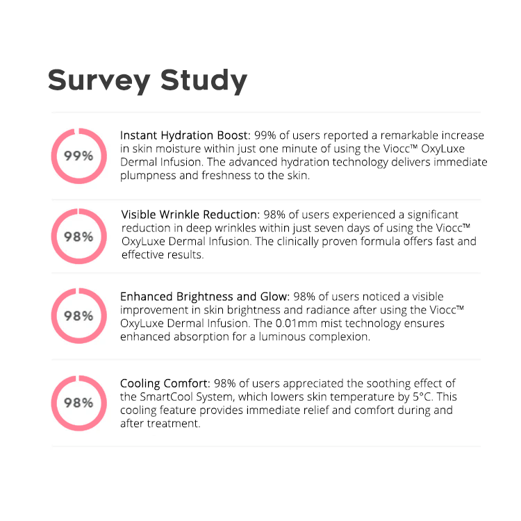 In just 7 days, witness a dramatic transformation as the VIOCC™ OxyLuxe Dermal Infusion works its magic. Enjoy visible reductions in deep wrinkles and acne inflammation, along with a surge in skin moisture and radiance.